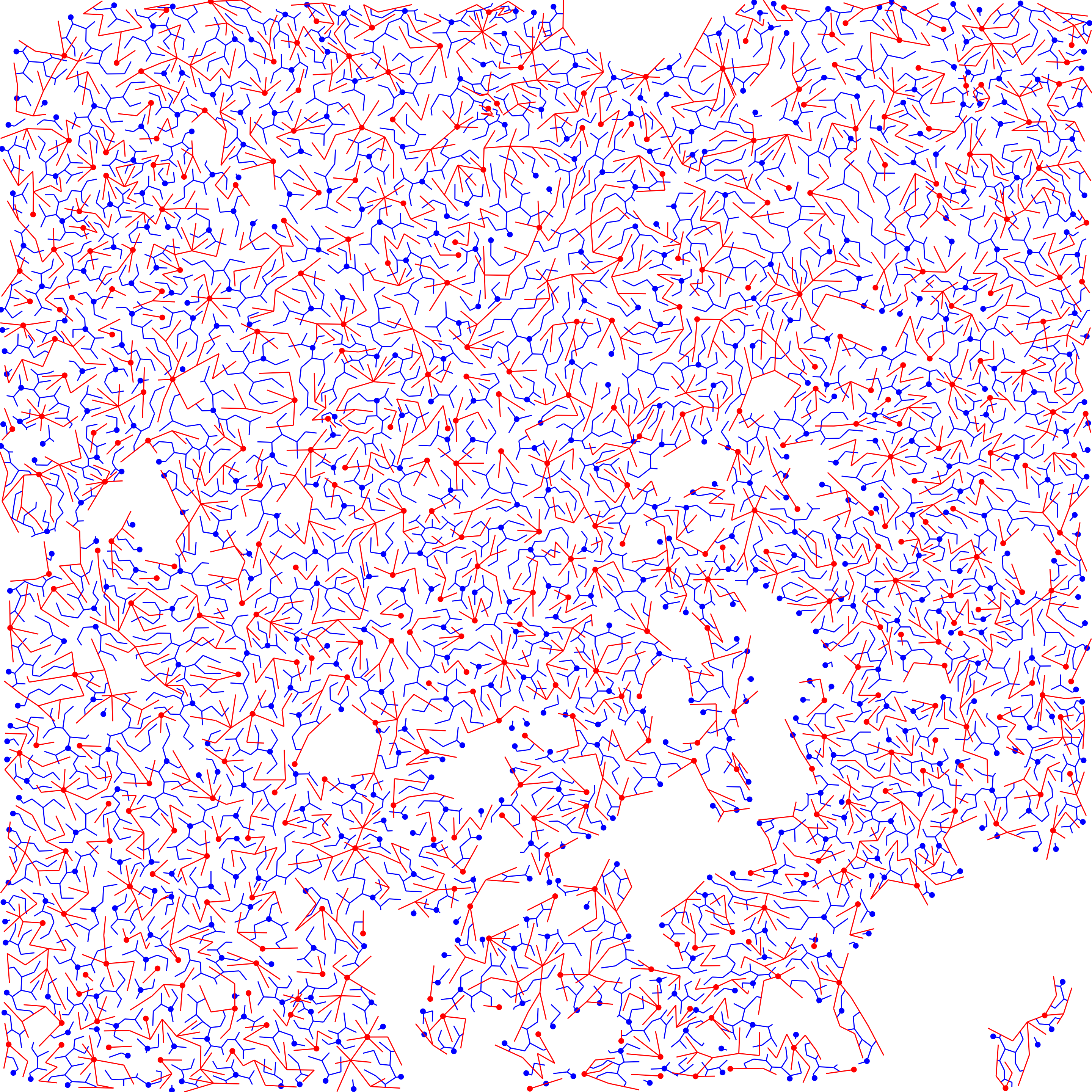 dmt$e_sep = dmt_get_separatrices(dmt)After DMT, we have a separatrix (in blue) and the primary forest connecting points (in red).